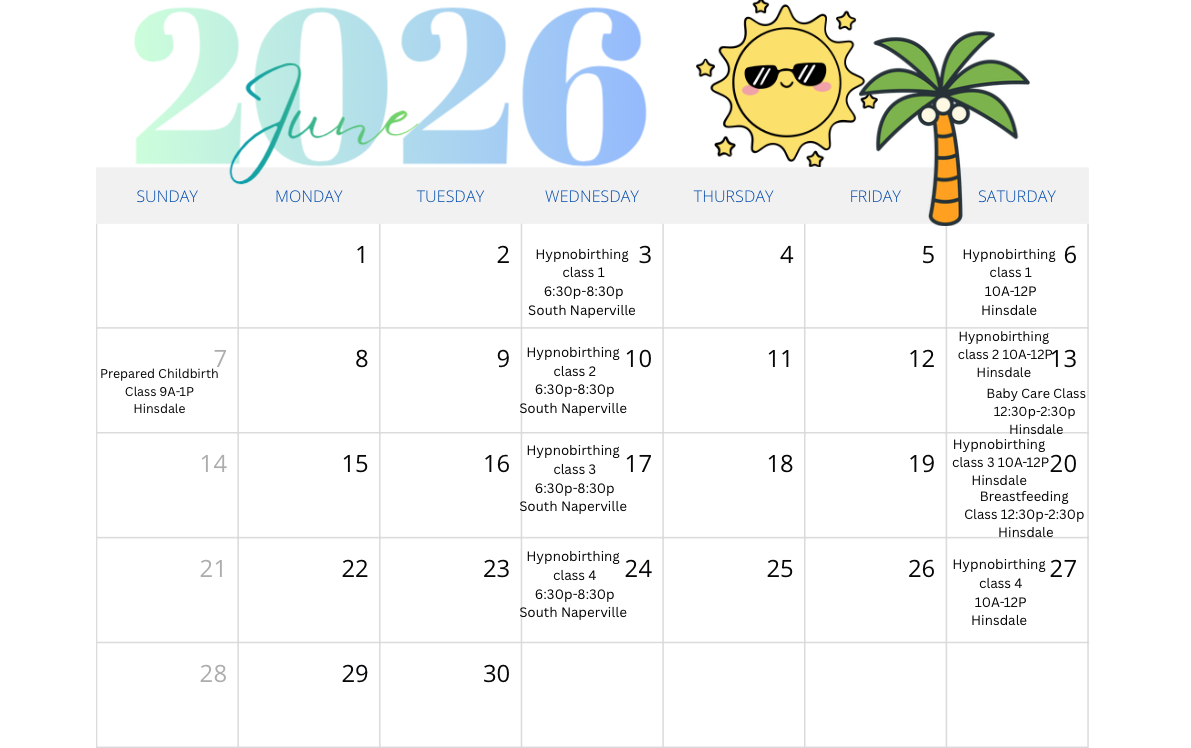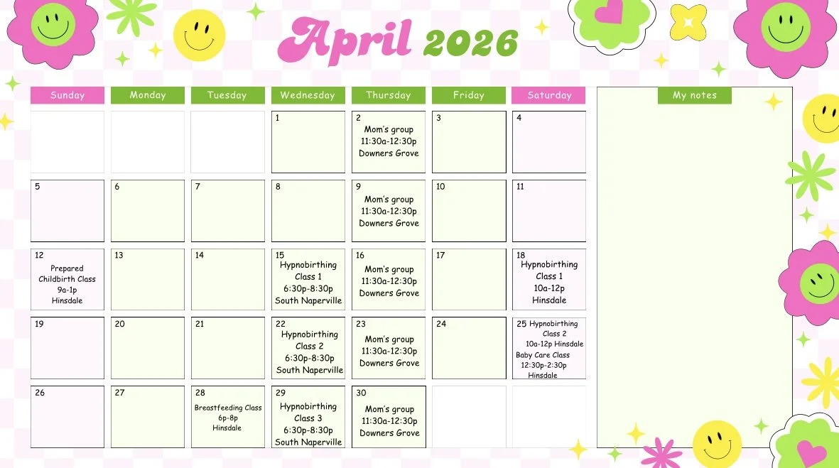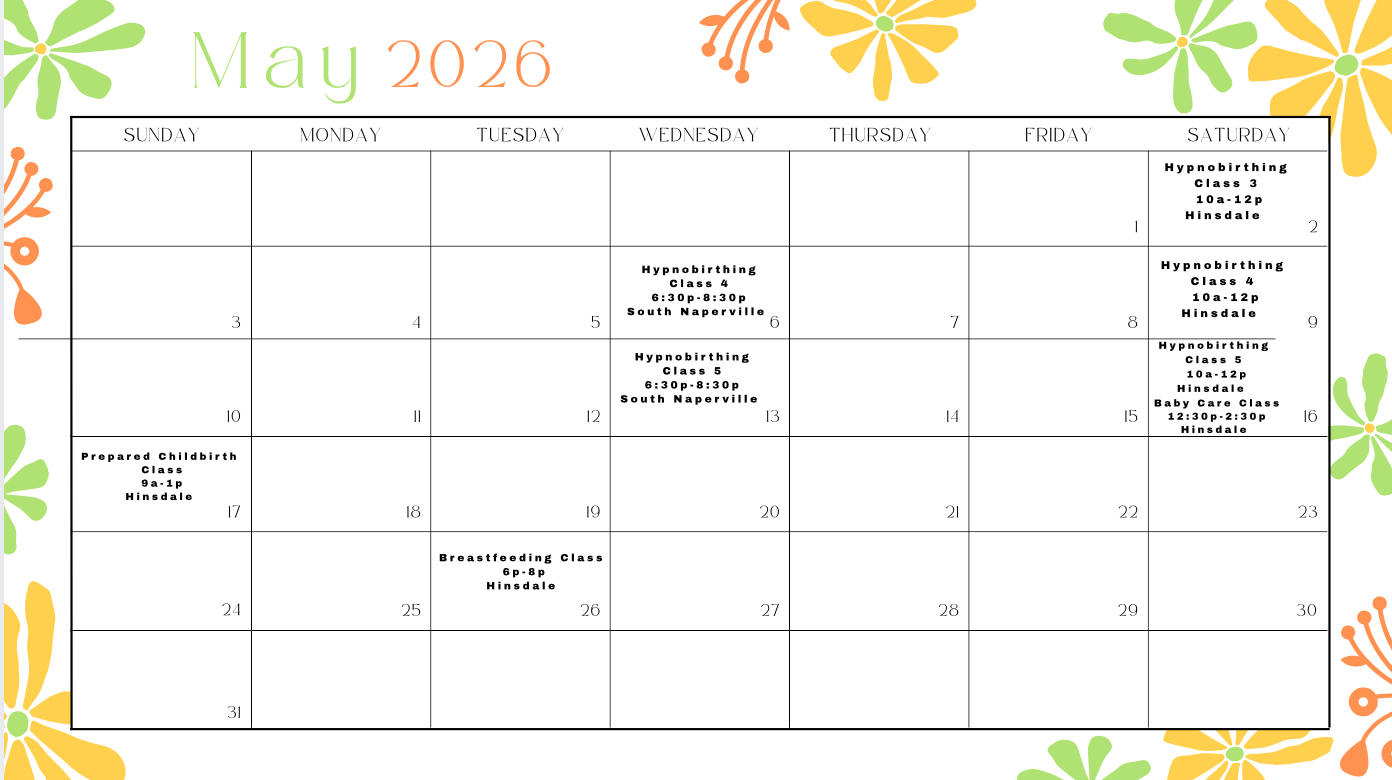 Welcome to our Class Calendar! Here you’ll find a monthly overview of all upcoming classes, workshops, and events offered by Blissful Births and Babies. From birth preparation and newborn care to breastfeeding support and postpartum wellness, our classes are designed to educate, empower, and support you through every stage of your journey.